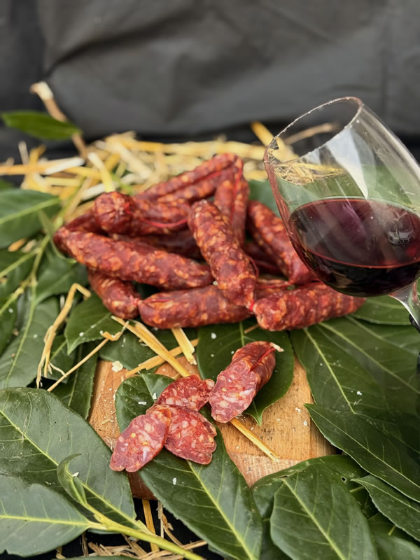Salsicce piccanti stagionate: sapore intenso, profumo rustico e un tocco di fuoco che accende ogni morso. Perfette con un buon bicchiere di rosso.