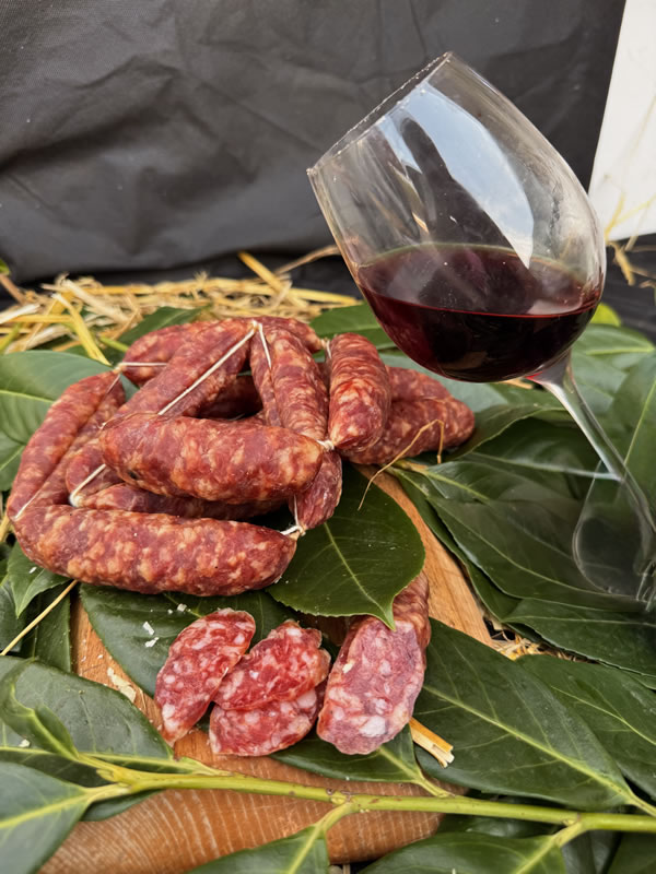 Salsicce dolci macinate a pezzi: rustiche, succose, con taglio grosso che esalta ogni boccone. Sapore pieno, profumo di tradizione.