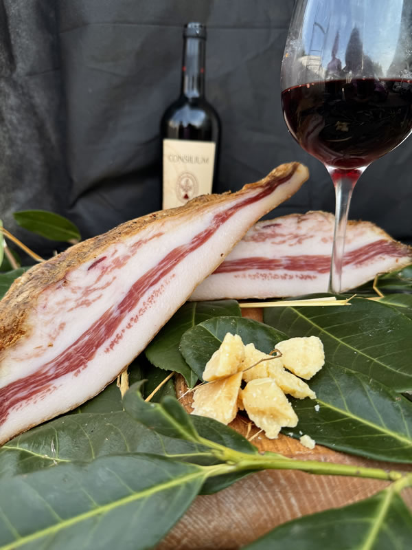 Pancetta fatta come una volta: salata a mano, speziata con pazienza e lasciata stagionare lentamente, come insegnavano i nonni. Solo sapore vero, quello di una volta.