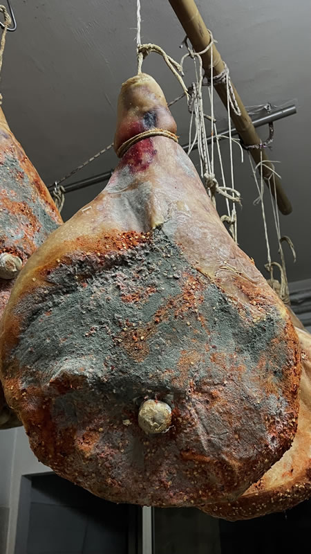 Prosciutto stagionato nel peperoncino, secondo l’antica usanza: gusto forte, aroma avvolgente e carattere genuino della tradizione di una volta.
